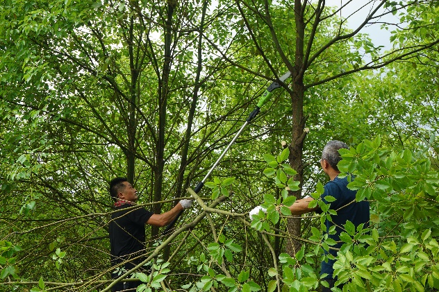砍伐人員使用高枝鋸砍伐油樟樹枝葉