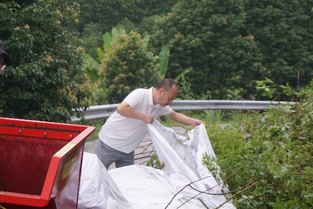 運輸人員將油樟樹碎片送至堆放點