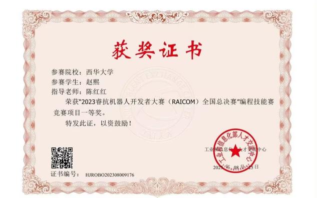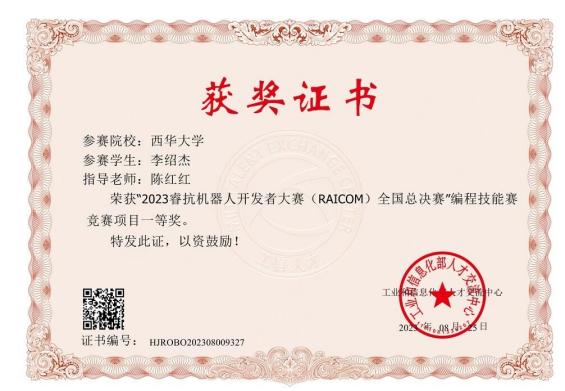近期,在由工業和信息化部人才交流中心和 RoboCom 國際公開賽組委會舉辦的2023 睿抗機器人開發者大賽(RAICOM) CAIP編程設計賽道全國總決賽中,我校ACM團隊成員獲得國賽一等獎兩項(李紹杰、趙熙)、二等獎一項(馮旭)、三等獎兩項(劉奇、羅淇鐳)的優異成績。