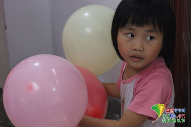 圖為樊殿寺童伴之家的孩子們拿著志愿者吹好后贈送的氣球愉快地互相打鬧,現場一片歡聲笑語。中國青年網通訊員李奇峰 攝