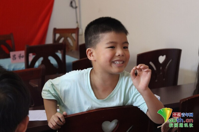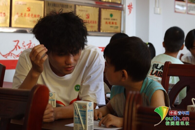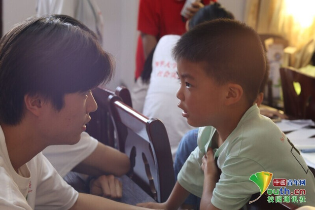 圖為志愿者認真傾聽孩子的心聲,用心傾聽細節,用愛灌注成長。中國青年網通訊員李奇峰 攝