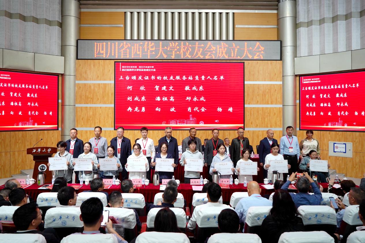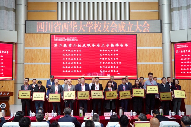 在授牌儀式上,主席臺領導分別為24個西華大學省外校友服務站、21個省內校友服務站和2個學院的校友分會授牌。