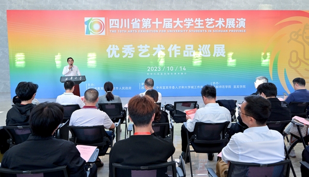 10月14日,四川省第十屆大學生藝術展演優秀藝術作品巡展在西華大學宜賓校區正式拉開帷幕。首站巡展由四川省教育廳、宜賓市人民政府聯合主辦,西華大學、宜賓市委人才和大學城工作局承辦,本次展覽匯集了近200件優秀藝術作品,包括書法、篆刻、繪畫和攝影。觀展者在志愿者講解中感嘆創作者技法高超,珍視著這些藝術作品所營造的氛圍和情感,領悟所蘊含的人生智慧和美好希冀。