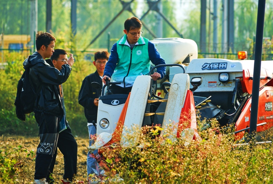 參觀學生在志愿者幫助下體驗水稻收割機操作