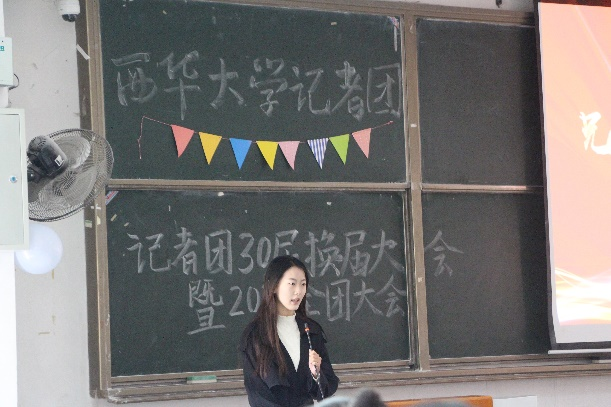最后,第三十屆干部代表謝明希、第三十屆新生代表陳洋和兄弟社團(tuán)代表曹帆慧分別發(fā)言。謝明希對(duì)新干事提出了幾點(diǎn)要求,希望他們“不忘初心”、“管理時(shí)間”、“保持熱情”,使記者團(tuán)邁向一個(gè)新臺(tái)階。陳洋講述了加入記者團(tuán)的初衷,表達(dá)了對(duì)記者團(tuán)工作生活的美好展望,號(hào)召干事們以高標(biāo)準(zhǔn)、高追求嚴(yán)格約束自我,以飽滿的工作熱情和用心的態(tài)度對(duì)待每一項(xiàng)工作。曹帆慧回憶了校史館講解團(tuán)與記者團(tuán)并肩走過(guò)的歷程,對(duì)記者團(tuán)予以美好的祝愿,期待講解團(tuán)與記者團(tuán)齊頭并進(jìn),用青春力量傳播西華的故事。
