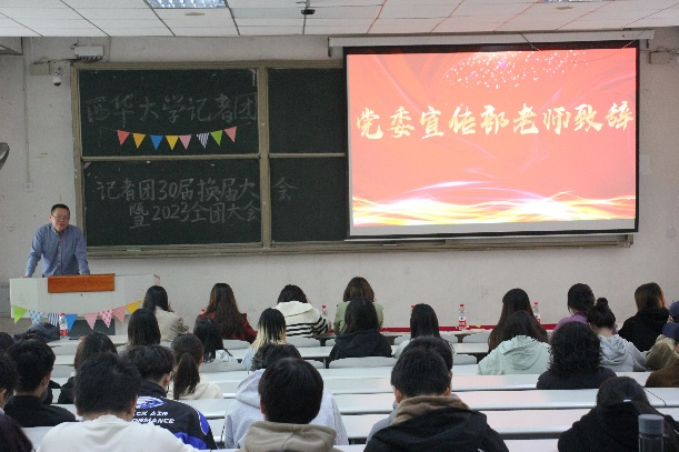 黨委宣傳部副部長(zhǎng)翟元平致辭,他提出了三個(gè)關(guān)鍵詞——“祝賀”“感謝”“希望”,以此表達(dá)對(duì)記者團(tuán)成員們的殷殷期許。“第一是祝賀,祝賀記者團(tuán)成立三十周年,祝賀新成員們做出了加入記者團(tuán)的重要選擇;第二是感謝,感謝黨委宣傳部各位老師以及第二十九屆成員的辛苦付出與巨大貢獻(xiàn);第三是希望,希望每一位成員都能夠牢記加入記者團(tuán)的初心。”最后,翟元平以三個(gè)精——“精心”“精細(xì)”“精品”激勵(lì)記者團(tuán)成員始終做到志存高遠(yuǎn),腳踏實(shí)地,為學(xué)校宣傳工作貢獻(xiàn)力量。