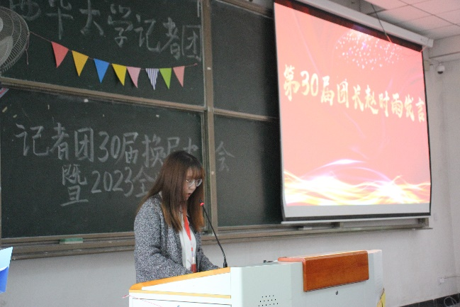 接著,第三十屆記者團(tuán)團(tuán)長(zhǎng)趙時(shí)雨上臺(tái)發(fā)言。她表達(dá)了對(duì)新成員的歡迎,肯定了記者團(tuán)成員們面對(duì)困難與挑戰(zhàn),始終堅(jiān)持奮斗,出色完成工作的精神品質(zhì)。她表達(dá)了對(duì)記者團(tuán)的期望,希望通過(guò)學(xué)生記者的視角展現(xiàn)西華大學(xué)的新聞動(dòng)態(tài),也希望記者團(tuán)成員們永懷最初的熱愛(ài),把握住平臺(tái)與機(jī)遇,獲得更多的成長(zhǎng)與進(jìn)步。