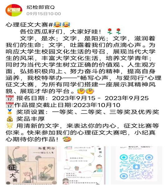 本次大賽是面向全體西華學子的一場心理征文比賽,自9月15日報名開始后,就得到了同學們的積極響應,來自不同年級、專業的同學紛紛投稿,體現了同學們對心理健康的高度重視。