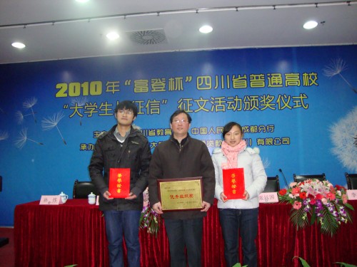 ????? 12月16日,2010年“富登杯”四川省普通高校“大學生與征信”征文活動頒獎儀式在電子科技大學舉行,頒獎典禮由四川省教育廳副廳長唐小我主持。我校被省教育廳、中國人民銀行成都分行評為活動“優秀組織獎”,人文學院學生楊易迪、生物工程學院學生余能飛分別榮獲征文一、二等獎,人文學院黨委副書記、副院長王大清帶領獲獎同學參加了頒獎典禮。 頒獎現場 責 編:翟元平 |