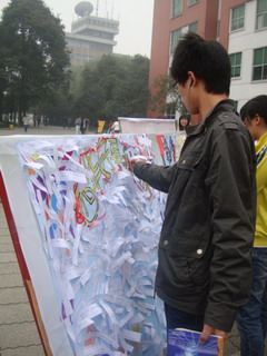 “這個我一定做到!”2008級電氣學院的陳明在明德廣場抽到一張紙條,上面寫著“關水龍頭:一滴水,一汪眼淚,一顆善良的心。”在簽上自己名字的時候,他微笑著對活動組織者肯定地說道。 11月11日,由西華大學學生傳媒中心主辦,西華社和西華廣播Young Radio承辦的記者節系列活動——“我為西華做件好事,人人爭當公益先鋒”主題活動在明德廣場舉行。兩塊展板上密密麻麻貼著署名的紙條,上面寫著“收集廢電池:少一次污染,健康了你我他”、“教室關燈:身后一片黑暗的時候,卻給了明天更多的光明。你做到了么?”等等。活動吸引了廣大師生的參與,大家紛紛表示,很多小事都是舉手之勞,大家都來為西華做件好事,西華就會變得更環保、更節能、更美好。 為倡導“節能”、“環保”理念,學生傳媒中心策劃了此次活動。活動內容就是隨機抽取紙條,根據紙條上的事項去完成任務,然后親自把“任務清單”貼在“西華好事我留名”的展板上。“啊,還要貼出來啊,要是我不去做的話,還真不好意思了呢!”09級理化學院的黃小倩說道。參與“我為西華做件好事,人人爭當公益先鋒”活動的有來自學校各年級專業的同學、有來自外校前來研究生考試報名確認的學生、有學校老師、有學校保安也有附屬學校的小同學們。 此前,由西華新聞網承辦的“見證西華——十大新聞評選”和映像廣角社承辦的“我的記者回憶”圖片展在明德廣場同時舉行。新聞和圖片均取材于學校近年的發展大事記,鮮活的文字和生動的圖片將西華歷史清晰地展示出來,引來廣大師生駐足觀看。 責 編:王蜀蘇 |