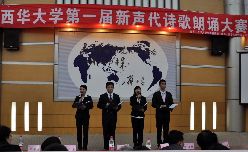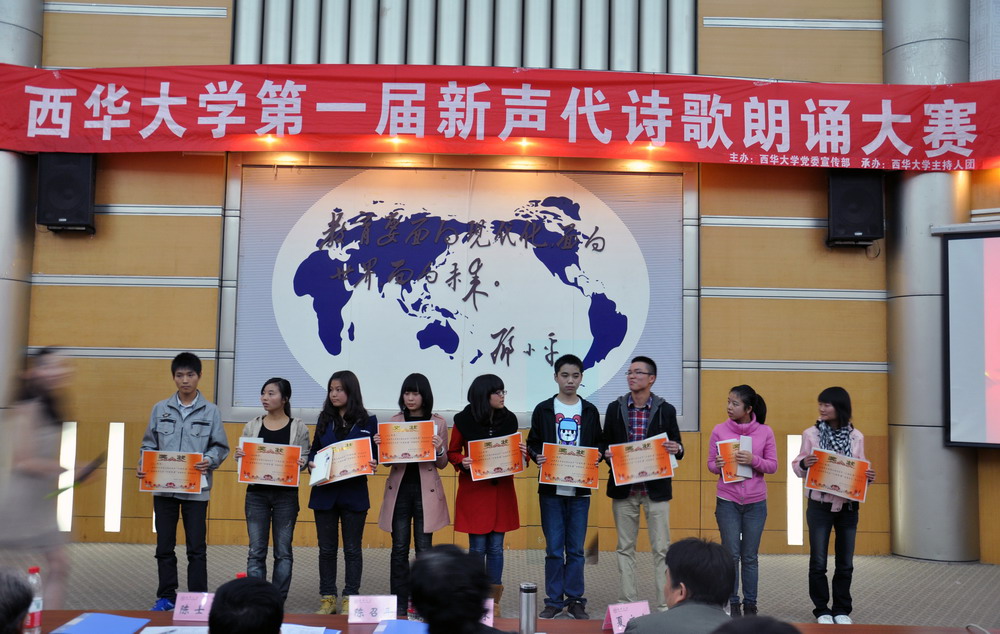 ????? ??? 來自各學院的20組選手是經過初賽的角逐進入決賽的。20組選手分成五組依序進行了詩歌朗誦。在交通與汽車工程學院侯婭婕、肖佳南帶來的《熱愛生命》的朗誦聲中,比賽打響了第一炮。來自管理學院的黃凱豐用低沉厚重的聲音深情朗誦了詩歌名篇《祖國啊,我親愛的祖國》,占據了第一組比賽的上風。隨后,電氣信息學院的唐靜同學憑借其飽滿的情感詮釋了詩歌《祖國啊,我要燃燒》,將比賽推向了熱潮。而11號選手鄭崇崇則以抑揚有致的一篇《問答》贏得了場上觀眾熱烈的掌聲。在此次比賽中,除了現代詩朗誦外也不乏古詩詞的朗誦,由西華教育電視臺選送的楊汀則通過形象的肢體動作將李白的《將進酒》演繹得豪邁精彩、別具一格。 ?選手比賽完后,由陳召平、楊紹林、陳士力、王蜀蘇四位評委老師帶來的詩朗誦《我愛你,中國》大氣昂揚,贏得了現場同學的一陣陣熱烈掌聲,再次將現場氣氛推向了新高。緊接著,陳士力老師又以一首《教師的心愿》,表達了作為一名人民教師對學生的期望和對教師崗位的熱愛,深深地打動了現場觀眾。 ?比賽最終結果是來自交通與汽車工程學院的鄭崇崇憑借最高分奪得本次詩歌朗誦大賽的桂冠。隨后,活動現場對詩歌朗誦大賽及本屆記者節公選出來的“十佳記者”“十佳新聞”進行了頒獎。 ?黨委宣傳部副部長田仁來作本屆記者節系列活動的總結發言。他指出,學生傳媒中心的學生干部是一支“招之即來、來之能戰、戰之能勝”的優秀新聞宣傳隊伍。他希望學生傳媒中心全體學生干部要堅持正確的輿論導向,忠實履行工作職責;要注重強化“三種精神”,即自我挑戰的精神、敢于奉獻的精神和團結協作的精神,努力在服務學校新聞宣傳工作和校園文化建設中不斷打造自己和提升自己。 ?至此,學生傳媒中心第六屆記者節系列活動圓滿落下帷幕。本屆記者節活動以其活動的豐富多樣性和大眾參與性引起了廣大同學的關注。