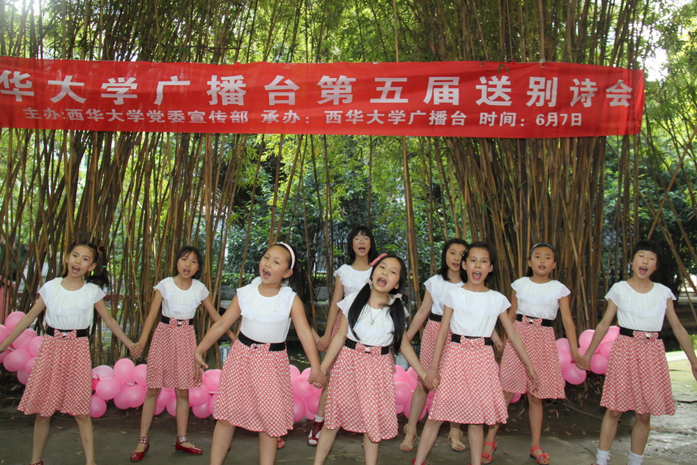 6月畢業(yè)季,充滿了離愁別緒,也彌漫著溫馨祝福。6月7日下午,由西華大學(xué)黨委宣傳部主辦、西華廣播臺(tái)承辦的西華大學(xué)第五屆送別詩(shī)會(huì)在二教楠苑舉行。黨委宣部老師、外國(guó)語(yǔ)學(xué)院王阿秋老師、各社團(tuán)代表以及西華廣播臺(tái)全體成員參加了此次送別詩(shī)會(huì)。 “長(zhǎng)亭外,古道邊,芳草碧連天,晚風(fēng)拂柳笛聲殘,夕陽(yáng)山外山……”由西華大學(xué)附屬實(shí)驗(yàn)小學(xué)的小朋友們帶來(lái)的一首《送別》拉開(kāi)了此次送別詩(shī)會(huì)的序幕。 送別詩(shī)會(huì)上,西華廣播臺(tái)的同學(xué)們深情地朗誦了精心準(zhǔn)備的詩(shī)歌,有中英結(jié)合的《The Love愛(ài)》,有方言版的《再別康橋》,有蘊(yùn)含真摯祝福的《青春,送別》。此外,還有由黨委宣傳部王蜀蘇老師、翟元平老師、張安林老師一起帶來(lái)的《送別》,外國(guó)語(yǔ)學(xué)院王阿秋老師帶來(lái)的《歌唱青春》,表達(dá)了老師們對(duì)08級(jí)畢業(yè)生們的誠(chéng)摯祝福。 本次送別詩(shī)會(huì),可以現(xiàn)場(chǎng)報(bào)名朗誦,這吸引了不少同學(xué)。09級(jí)經(jīng)濟(jì)與貿(mào)易學(xué)院的嚴(yán)春麗現(xiàn)場(chǎng)報(bào)名,參與朗誦并祝愿08級(jí)畢業(yè)生們事業(yè)一帆風(fēng)順,越來(lái)越好。電視臺(tái)、西華社、主持人團(tuán)隊(duì)以及西華廣播臺(tái)09級(jí)主播等代表也參與到了此次詩(shī)會(huì)當(dāng)中。 此次送別詩(shī)會(huì)的圓滿舉行,不僅表達(dá)了老師、同學(xué)對(duì)08級(jí)畢業(yè)生們的祝福,同時(shí)也豐富了校園文化,濃厚了校園氛圍。