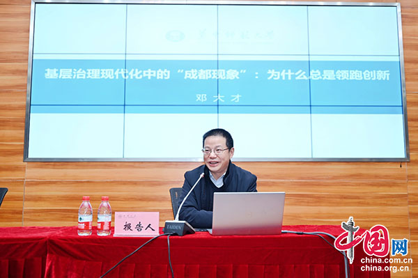 同時,華中師范大學中國農村研究院鄧大才教授作了題為“基層治理現代化中的‘成都現象’:為什么總是領跑創新”的主旨報告。鄧大才根據自身在成都的調研經歷,對基層治理現代化創新中的“成都現象”進行了深入探究,對成都的基層治理實踐影響因素進行了高度凝練和概括,指出成都的創新有著體制性、增量性、可持續性和領先性特點,并從領導力結構、制度結構和文化結構三個方面分析了“成都現象”中的結構性因素。