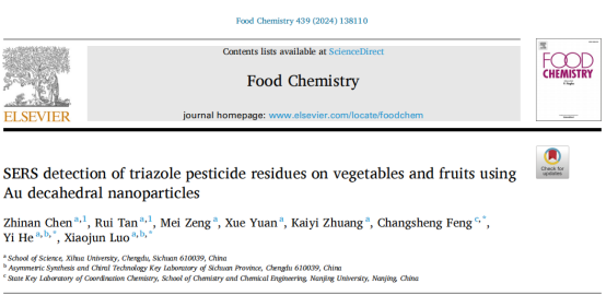 近期,理學院表面增強拉曼光譜團隊(何毅、羅曉俊、吳彩駿等)在分析化學領域Top期刊Sensors and Actuators B: Chemical(SCI一區,IF:8.4),食品科技領域Top期刊Food Chemistry (SCI一區,IF:8.8)和材料科學領域Top期刊ACS Applied Materials & Interfaces (SCI二區,IF:9.5)上發表研究論文4篇。何毅和羅曉俊老師為論文通訊作者,西華大學碩士研究生譚銳、張潤滋,四川大學研究生陳治男做了大量科研工作,同時該成果還得到了南京大學和四川省不對稱合成與手性技術省重點實驗室的大力支持和協助。