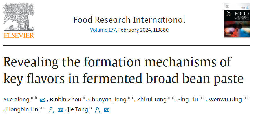 近日,食品與生物工程學院“發酵調味品科學與工程”團隊在農林科學領域1區TOP期刊《Food Research International》 (Q1, IF:8.1)發表題為“Revealing the formation mechanisms of key flavors in fermented broad bean paste”的研究性論文。西華大學2021級碩士研究生向粵為論文第一作者,川渝特色食品重慶市重點實驗室林洪斌副教授和食品微生物四川省重點實驗室唐潔教授為論文通訊作者。該研究工作得到了四川省科技廳重點研發項目(2020YFN0151,23ZDYF3100)的支持。