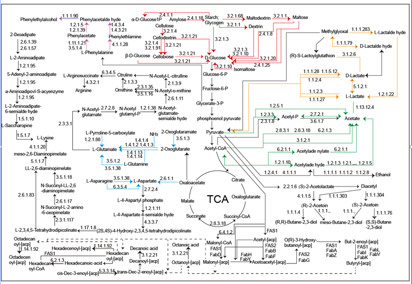 結果表明,其中雞葡萄球菌是微生物群落中的主要微生物,占39.13%;敏捷乳桿菌次之,占13.76%;黃曲霉是相對豐度最高的真菌,占3.02%。KEGG途徑富集分析表明,碳水化合物代謝和氨基酸代謝是主要的代謝途徑。糖苷水解酶和糖基轉移酶基因最為豐富,占活性酶基因總數70%以上。共注釋了113種與關鍵風味相關的酶,以及39種與酶相對應的微生物。其中,雞葡萄球菌、敏捷乳桿菌、融合魏斯氏菌、乳酸片球菌、克氏葡萄球菌、米曲霉和黃曲霉在代謝途徑中發揮了關鍵作用。該研究揭示了發酵蠶豆中關鍵風味的形成機理,對指導郫縣豆瓣生產的品質控制具有重要意義。