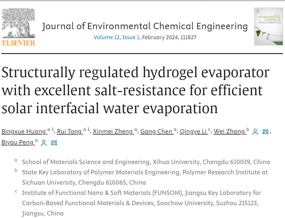 近日,材料科學(xué)與工程學(xué)院彭必友教授團(tuán)隊(duì)在國際一流的環(huán)境化學(xué)工程學(xué)報(bào)雜志Journal of Environmental Chemical Engineering(Q1,IF: 7.7)發(fā)表題為“Structurally regulated hydrogel evaporator with excellent salt-resistance for efficient solar interfacial water evaporation”的研究論文。黃冰雪博士、研究生唐銳為論文的第一作者,四川大學(xué)高分子材料工程國家重點(diǎn)實(shí)驗(yàn)室張偉教授、西華大學(xué)材料科學(xué)與工程學(xué)院彭必友教授為通訊作者。該項(xiàng)研究工作得到了四川省科技廳重點(diǎn)研發(fā)項(xiàng)目(Grant Nos. 2022YFG0366; 2023NSFSC04430)的支持。