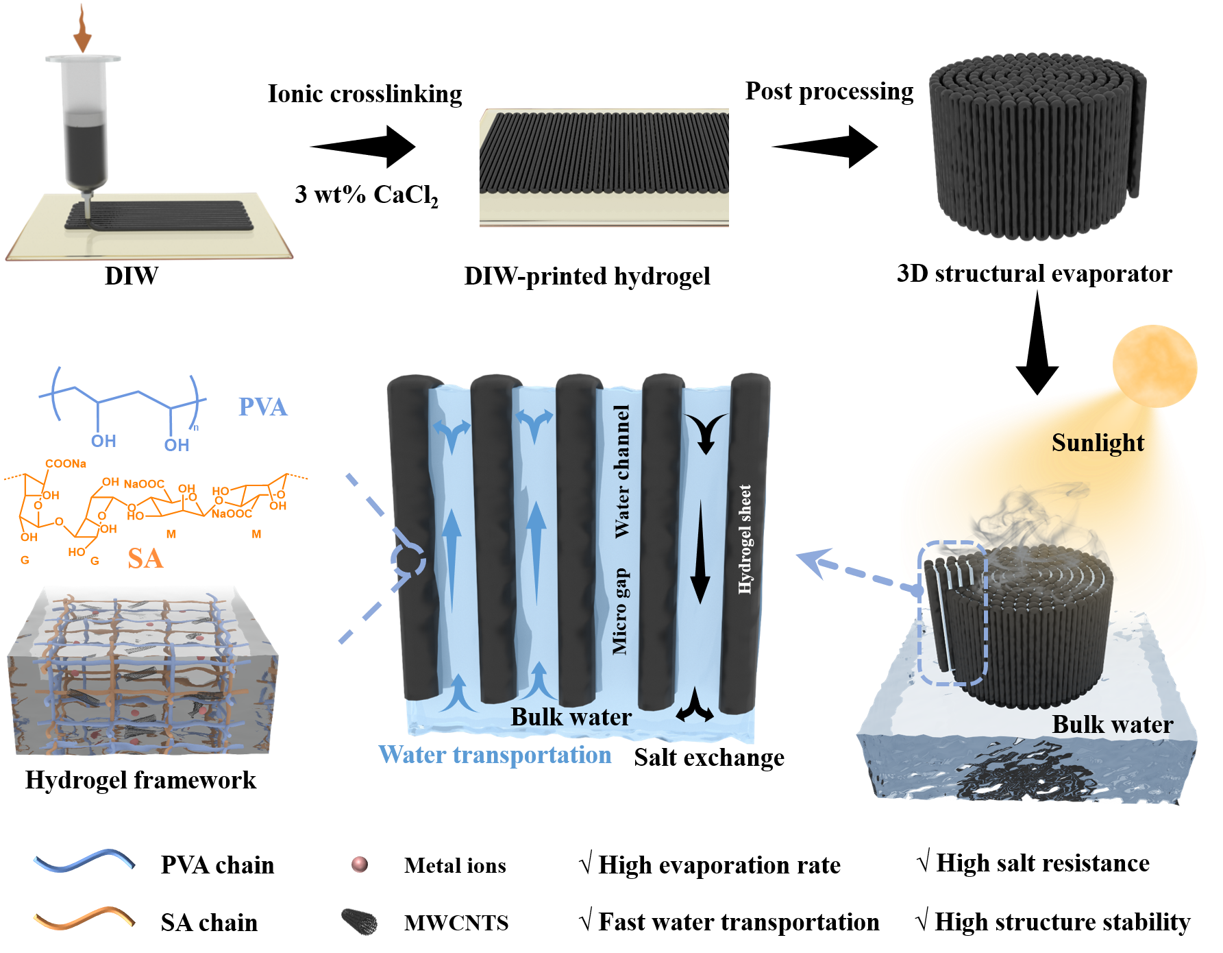 鑒于此,團(tuán)隊(duì)基于自研的新型直寫3D打印平臺,開發(fā)了三維結(jié)構(gòu)化光熱轉(zhuǎn)換水凝膠材料,并以其為基礎(chǔ)構(gòu)建了太陽能蒸發(fā)器。該研究成果可廣泛應(yīng)用于海水淡化領(lǐng)域。得益于3D打印技術(shù)在水凝膠基體中構(gòu)建的連通水體和蒸發(fā)面的微通道結(jié)構(gòu),項(xiàng)目所構(gòu)建的太陽能蒸發(fā)器具有優(yōu)異的水傳輸效率,表現(xiàn)出了高效且穩(wěn)定的水蒸發(fā)效率(3.2 kg m-2 h-1)和優(yōu)異的環(huán)境耐受性能。不僅如此,3D打印技術(shù)構(gòu)建的微通道還提供了大量的傳質(zhì)空間,為蒸發(fā)后濃縮水體的排出提供了充足的通道,因此基于此所構(gòu)建的太陽能蒸發(fā)器在高濃度鹽水和污染廢物中依然能夠保持其優(yōu)異的水蒸發(fā)性能,展現(xiàn)出了良好的應(yīng)用前景。