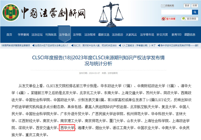 根據中國法學創新網發布的《2023年度CLSCI來源期刊知識產權法學發布情況與統計分析》,2023年度來自40家研究機構的學者在知識產權法學CLSCI來源期刊發表論文73篇,西華大學位列40家發文單位之一。張利國教授發表在CLSCI期刊《政治與法律》的論文《論數字技術對表演者權保護的沖擊與法律上的回應》,提出了應對數字技術沖擊有效加強表演者權保護的具體方案。