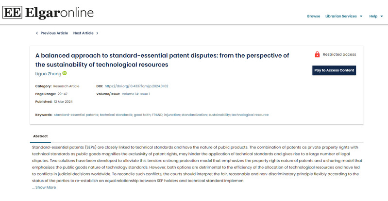 近日,我校法學與社會學學院張利國教授在國際知識產權一流期刊Queen Mary Journal of Intellectual Property 2024年第1期發表了學術論文“A balanced approach to standard-essential patent disputes: from the perspective of the sustainability of technological resources”,該文分析了解決專利與技術標準沖突的兩種方案,指出這兩種方案都不利于技術資源的配置效率,進而提出法律解釋要維護標準必要專利權利人與技術標準實施者之間的平等關系,促進當事人自愿達成專利許可協議的解決方案。