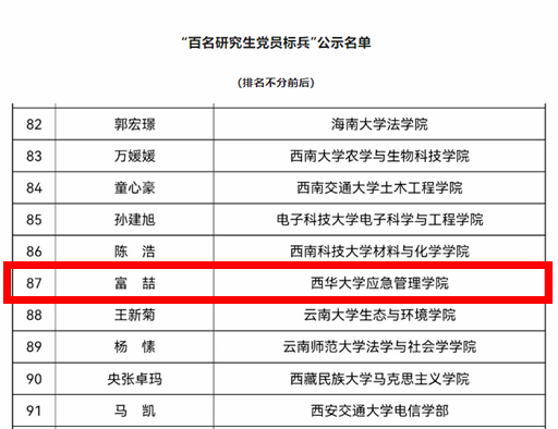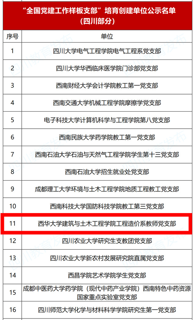 3月18日,教育部分別公示了第四批新時代高校黨建示范創(chuàng)建和質(zhì)量創(chuàng)優(yōu)工作遴選結(jié)果、第三批全國高校“百個研究生樣板黨支部”和“百名研究生黨員標(biāo)兵”遴選結(jié)果名單。經(jīng)省級黨委教育工作部門推薦、資格審查、專家評審、集中審議,遴選產(chǎn)生了10個全國黨建工作示范高校、100個全國黨建工作標(biāo)桿院系、1001個全國黨建工作樣板支部,以及100個研究生樣板黨支部和100名研究生黨員標(biāo)兵。其中,我校建筑與土木工程學(xué)院工程造價系教師黨支部入選“全國黨建工作樣板支部”培育創(chuàng)建單位,應(yīng)急管理學(xué)院2021級土木水利專業(yè)碩士生富喆獲評“百名研究生黨員標(biāo)兵”。此外,在中共四川省委教育工委公布的“第二批新時代四川高校黨建示范創(chuàng)建和質(zhì)量創(chuàng)優(yōu)培育單位”名單中,我校現(xiàn)代農(nóng)業(yè)裝備研究院教師黨支部入選“四川高校黨建工作樣板支部”培育單位,馬克思主義學(xué)院2021級研究生黨支部入選四川高校“研究生樣板黨支部”培育單位。