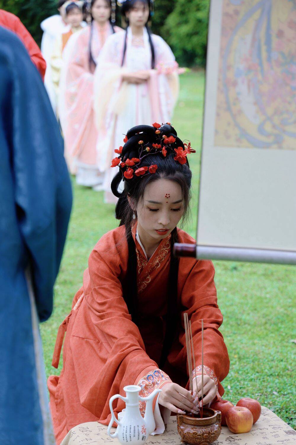 花朝節是百花誕辰之日。當天下午,由學生主動報名扮演的十二花神完成前期妝造,正式開始了花朝節祭祀活動。焚香、祭拜、受百花神福胙……一系列傳統祭祀花神流程在西華校園里得以重現。