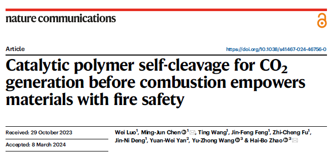 近日,理學院功能高分子材料綠色制備與循環利用研究團隊2021級碩士研究生羅偉,以第一作者身份在Nature Communications(IF=16.6)上發表題為“Catalytic polymer self-cleavage for CO2 generation before combustion empowers materials with fire safety”的研究論文。理學院陳明軍教授和四川大學趙海波教授為共同通訊作者,該工作得到了四川大學王玉忠院士和中車集團株洲時代新材料科技股份有限公司正高級工程師顏淵巍博士等人的指導與幫助。該研究得到了國家自然科學基金項目(21975208、U22A20150和22205184)和四川省科技計劃項目(2023ZYD0030和2020JDJQ0062)的資助。