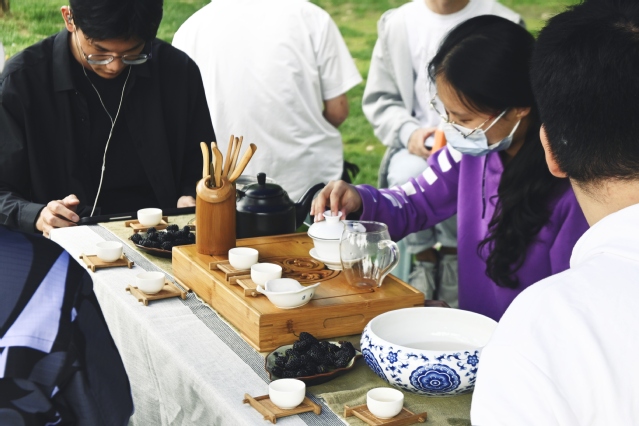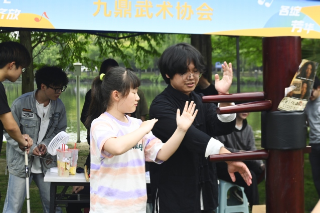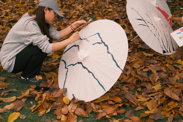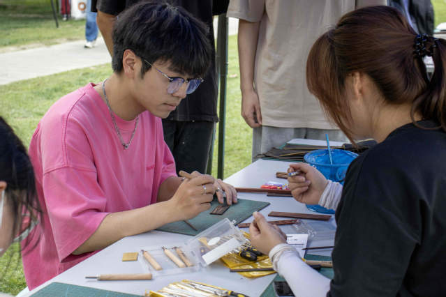 活動現場,同學們興致盎然,于各種傳統手工制作技藝體驗攤位前駐足流連。服章之華漢服社與書畫協會提供了團扇繪制、簪花欣賞、油紙傘繪制等項目,過往的師生參與其中,體驗感滿滿。走至茶文化協會,熱情的社團學子邀請同學們品茶,帶大家感受中國傳統茶文化的濃厚意蘊。在太極風協會的攤位,幾位同學激動地展示了一套“陳氏精要十八式”太極拳。協會負責同學說:“練習太極,不僅能夠增強身體素質,修身養性,更能加深同學們對中華傳統文化的理解,歡迎同學們過來體驗。”