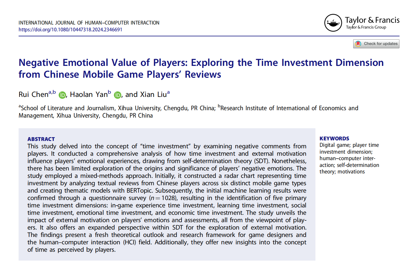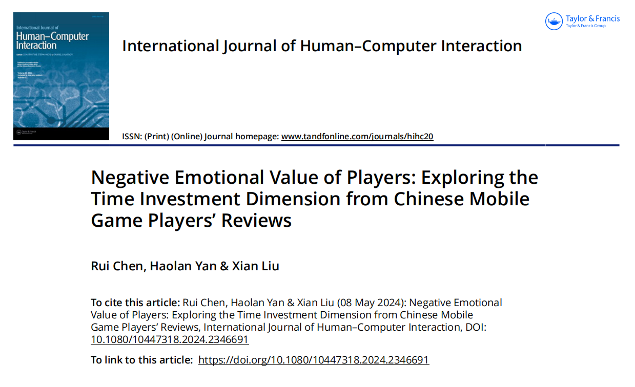 近日,文學與新聞傳播學院、國際經濟與管理研究院陳睿副教授研究團隊,在計算機科學與人機交互領域國際期刊《International Journal of Human–Computer Interaction》(SSCI JCR 1區)發表題為“Negative Emotional Value of Players: Exploring the Time Investment Dimension from Chinese Mobile Game Players’Reviews”的文化研究論文;陳睿副教授為論文的第一作者,國際經濟與管理研究院2022級工商管理專業碩士研究生嚴浩瀾、文學與新聞傳播學院2021級文藝學專業碩士研究生劉顯為論文共同作者。西華大學為論文的第一完成單位和通訊單位。該研究工作為國家自然科學基金面上項目(72374171)的階段性成果之一。