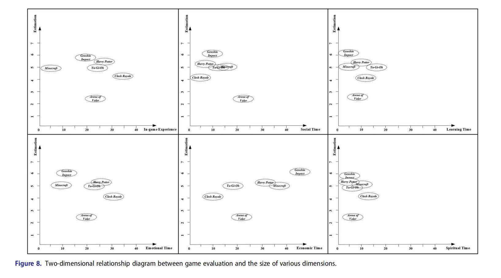 Figure 8. Two-dimensional Relationship Diagram between Game Evaluation and the Size of Various Dimensions.