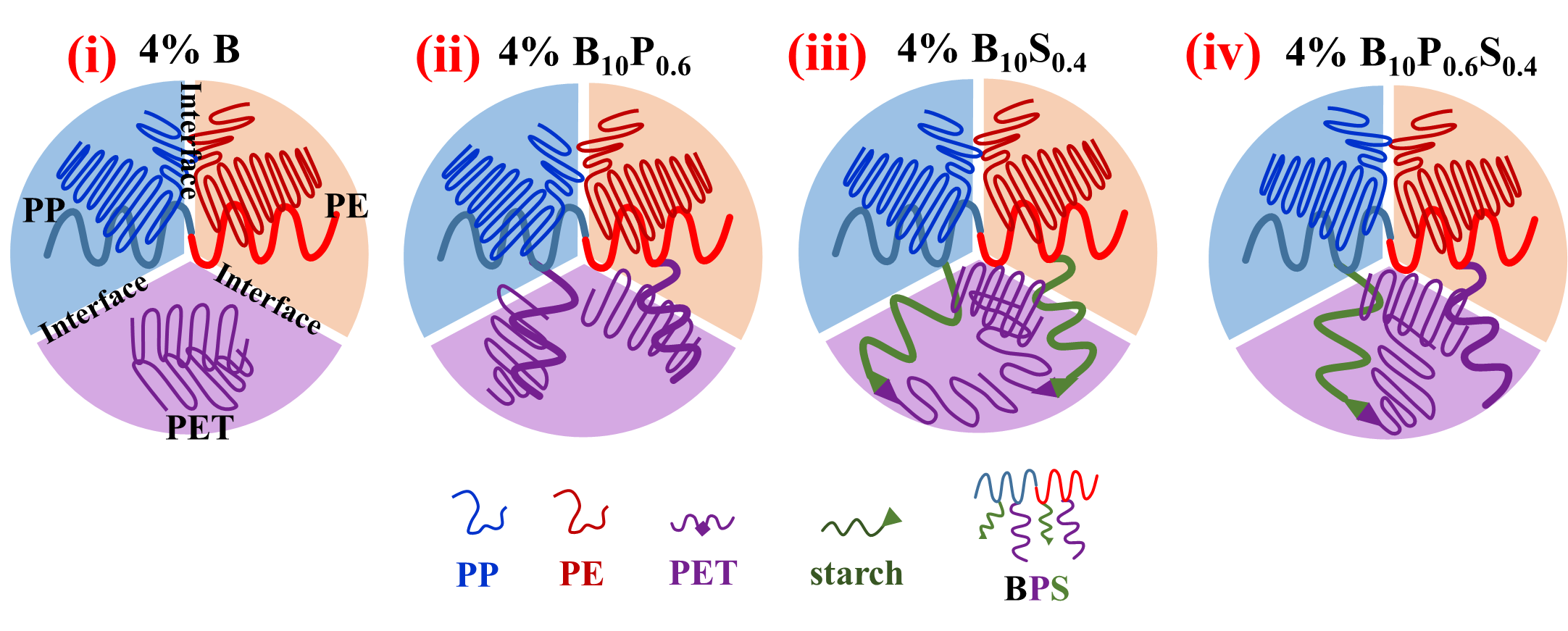 該文進一步揭示了該大分子增容劑的增容機理。若將BPS添加到熔融共混物中,它們將主要存在于塑料的界面中。BPS的PET鏈段可以與均聚物中的PET共結晶和糾纏。此外,淀粉鏈段可以與PET進行酯交換反應,生成starch-b-PET嵌段共聚物,從而增大與均聚物進行鏈纏結的可能性(圖3)。
