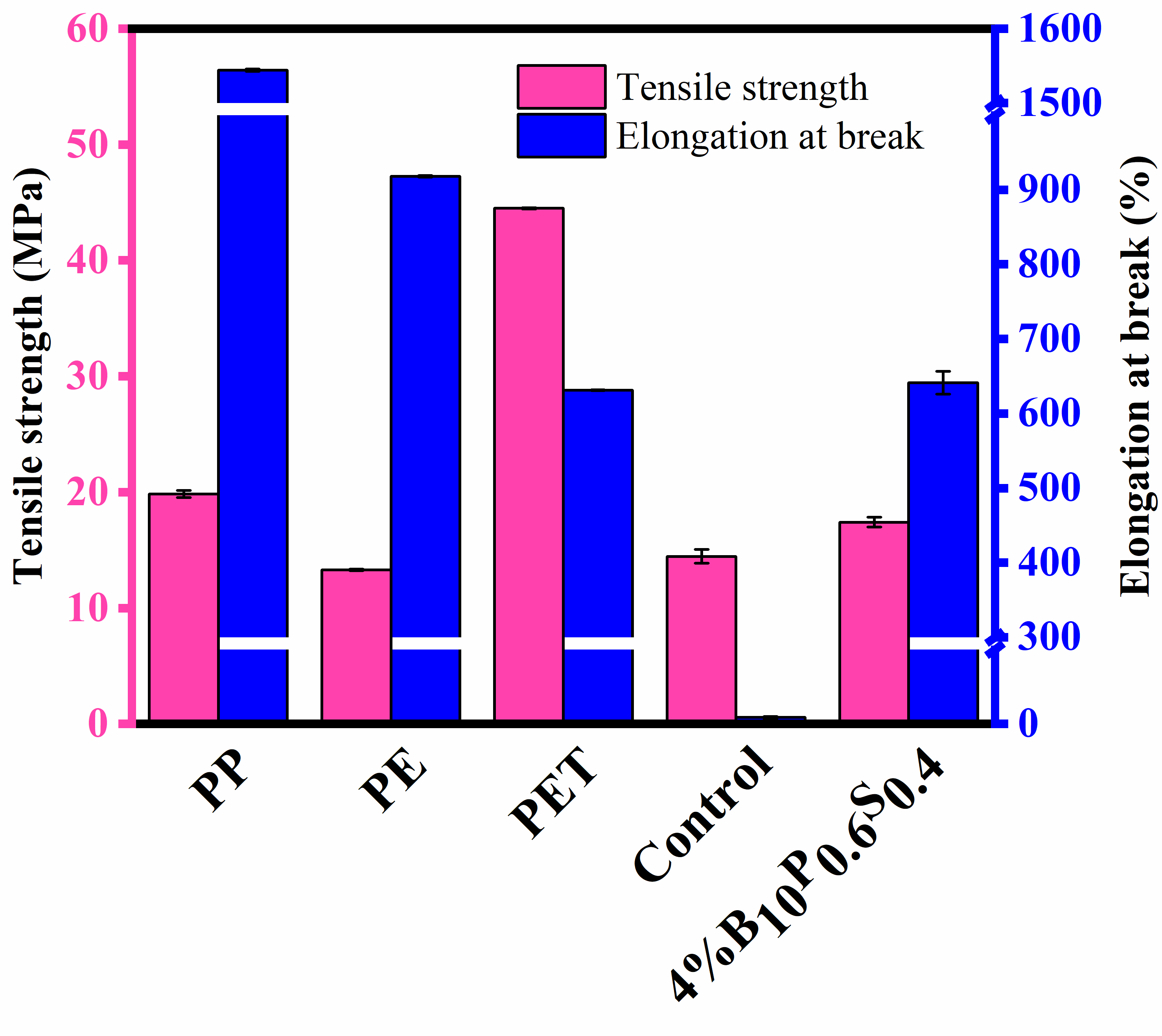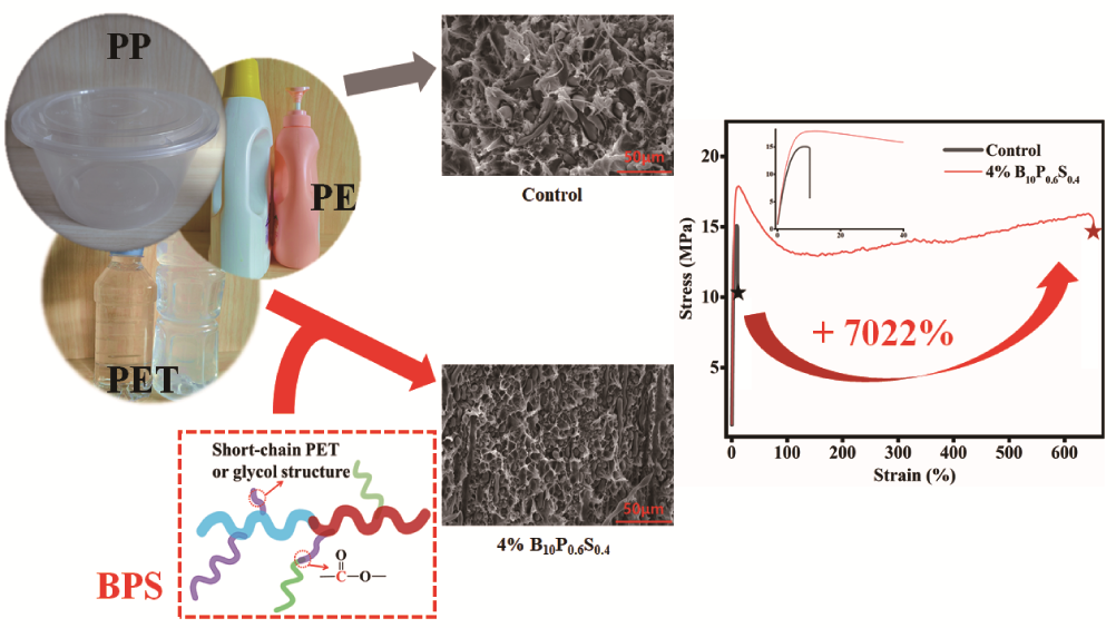 本文合成并使用了一種新型接枝共聚物(PP-b-PE)-g-PET, starch (BPS),作為PP/PE/PET三元共混塑料的增容劑,明顯提升了混合塑料的力學表現(以斷裂伸長率為代表,提升超過7000%,圖1)。