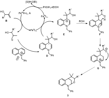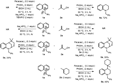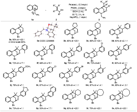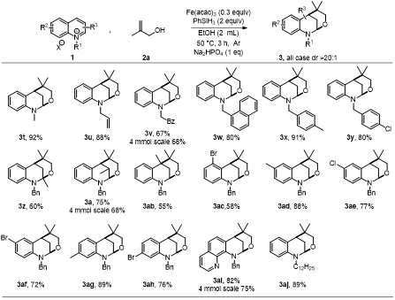 作者以N-芐基喹啉季銨鹽1a和2-甲基烯丙醇2a作為模板底物,對(duì)催化劑、還原劑、溶劑、溫度、時(shí)間和添加劑等進(jìn)行篩選,得到最優(yōu)條件:在氬氣氛圍下,以乙醇為溶劑,乙酰丙酮鐵為催化劑,苯硅烷為還原劑,磷酸氫二鈉為添加劑,50度油浴下反應(yīng)3小時(shí),最高91%的收率得到目標(biāo)產(chǎn)物。作者通過1H NMR,13C NMR,HR-MS、XRD對(duì)化合物3a進(jìn)行了結(jié)構(gòu)鑒定。