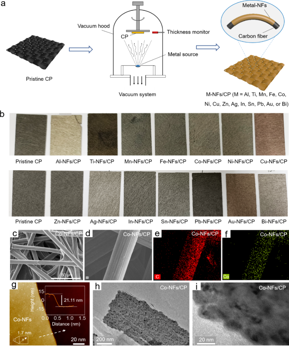 圖1. (a)通過熱蒸鍍法在碳紙上生長金屬M(M=Al、Ti、Mn、Fe、Co、Ni、Cu、Zn、Ag、In、Sn、Pb、Au或Bi)納米膜的合成流程圖(b) M-NFs/CP電極的光學(xué)照片(c)Co-NFs/CP電極的(c, d)掃描電子顯微鏡, (e, f)元素面分布, (g)原子力顯微鏡,(h)透射電子顯微鏡和(i)高分辨率透射電子顯微鏡圖。