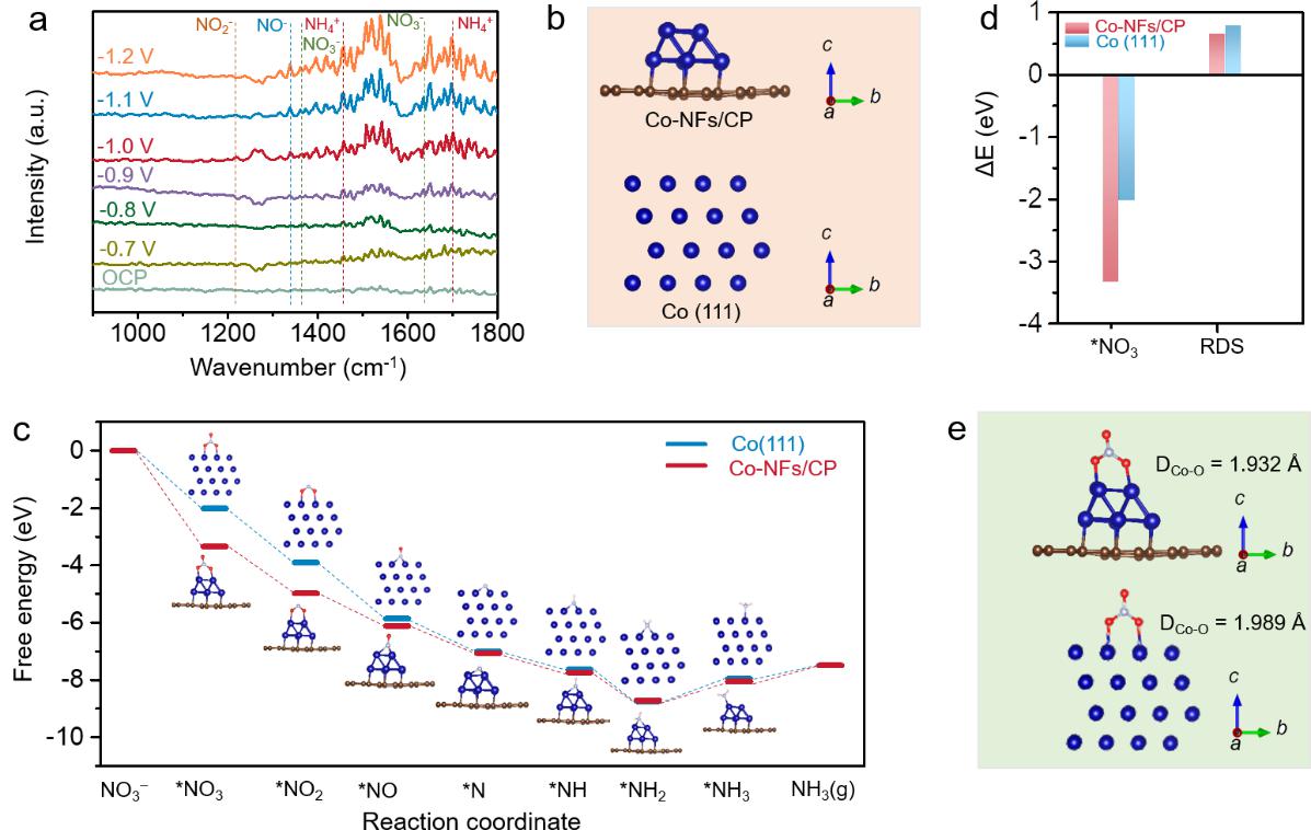 圖5. 電催化NITRR過程中,原位紅外光譜檢測Co-NFs/CP表面產(chǎn)生的關(guān)鍵活性中間體信號,并結(jié)合理論計算研究在Co-NFs/CP表面上電催化NITRR合成氨的可能反應(yīng)機(jī)制