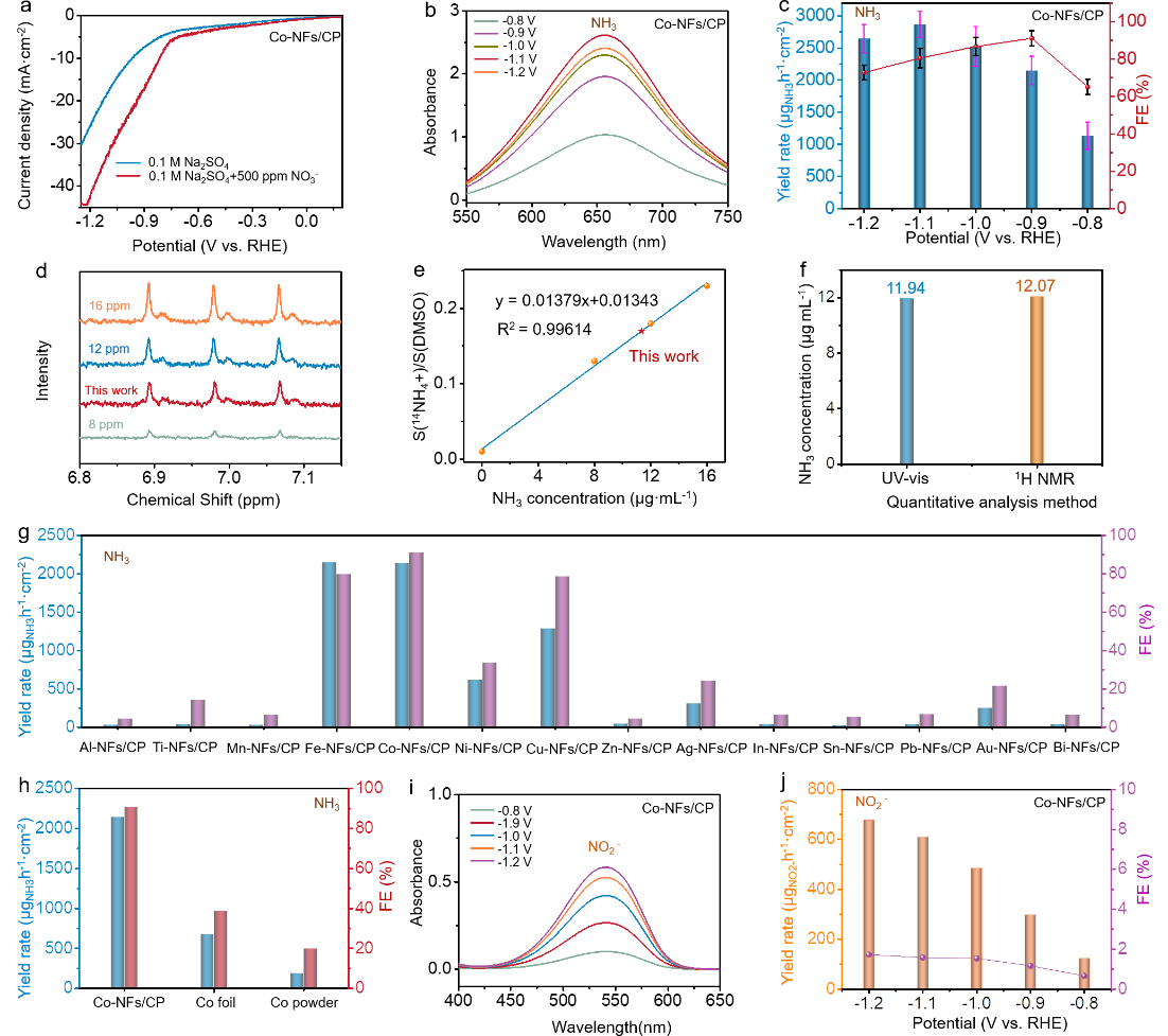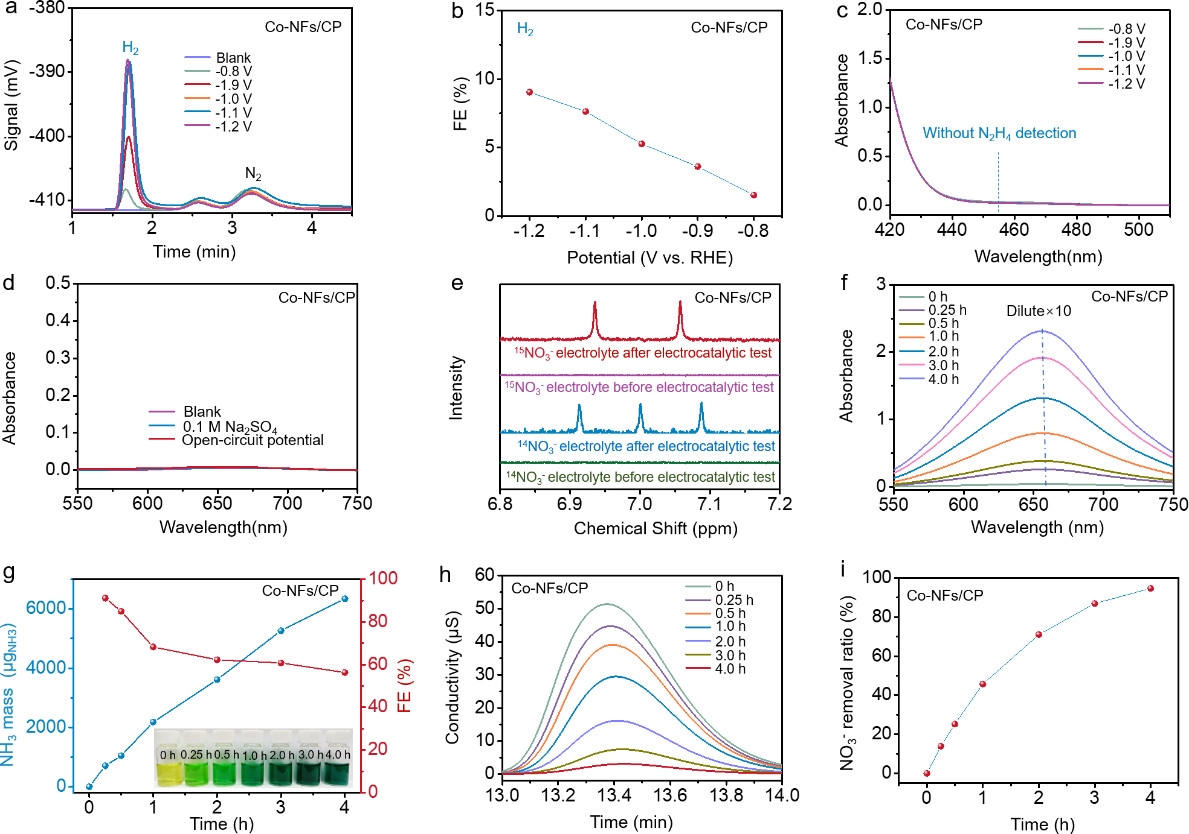 圖4. Co-NFs/CP對電催化NITRR合成氨的產(chǎn)物選擇性和穩(wěn)定性表征