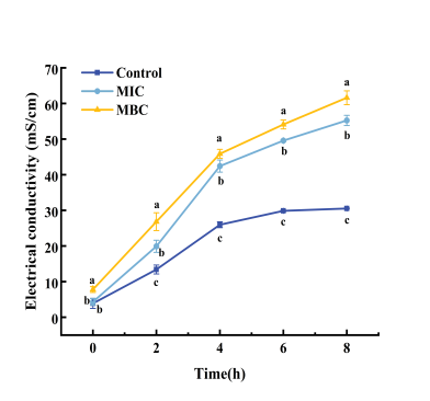 研究分析AEO對P.fluorescens的抗菌活性發現,AEO對P. fluorescens 的MIC為12.5 μl/mL,MBC為25 μl/mL,SEM觀察到熒光假單胞菌在2MIC的AEO處理后細胞形態受損嚴重,菌體大量死亡,顯著抑制了細胞生長速率。此外,AEO處理導致AKP酶活性和電導率增加,細胞內核酸和蛋白等大分子合成物質明顯泄露,證明細胞壁和細胞膜的完整性被破壞。