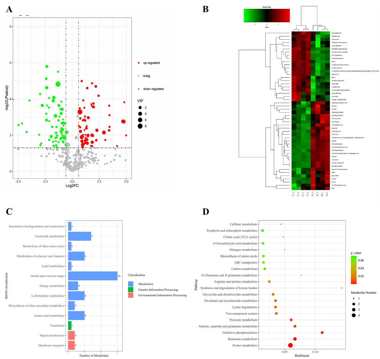 圖 3 (A) 差異代謝物火山圖;(B) 差異代謝物聚類熱圖;(C) KEGG 代謝通路層次分類圖;(D) KEGG 通路富集分析氣泡圖