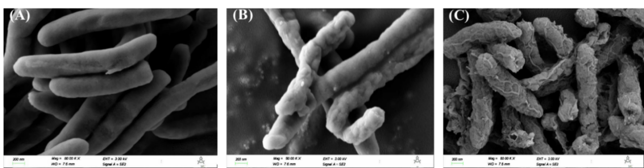 圖 2 P. fluorescens的掃描電鏡:(A)對照組;(B)MIC 組;(C)2MIC 組