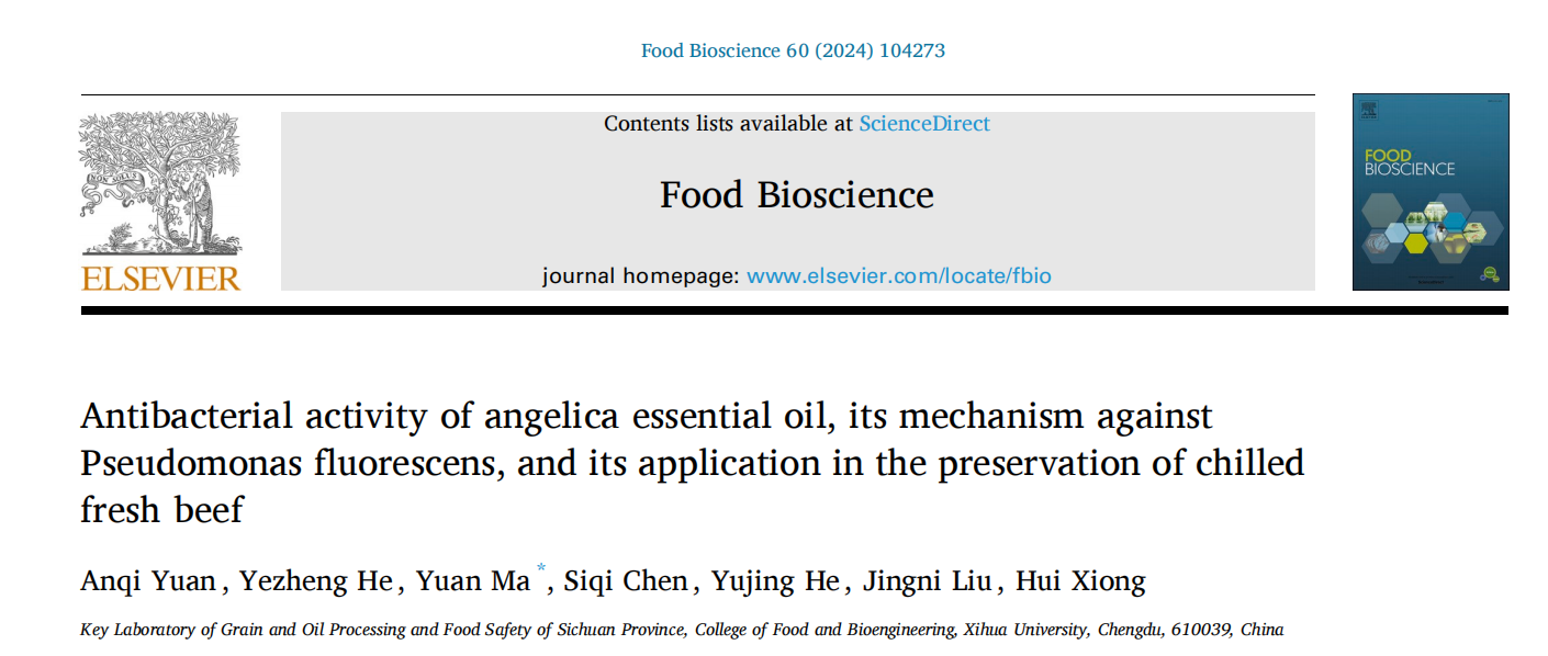 近日,食品與生物工程學院馬嫄教授課題組在1區TOP期刊Food Bioscience(Q1,IF: 5.2)發表題為“Antibacterial activity of angelica essential oil, its mechanism against Pseudomonas fluorescens, and its application in the preservation of chilled fresh beef”的研究性論文。該文第一作者為研究生袁安琪,通訊作者為馬嫄教授。