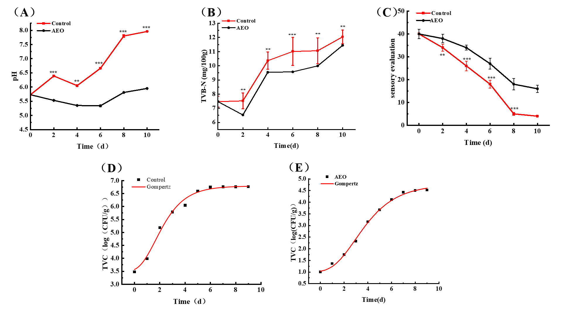 圖5 AEO 復合膜對(A)冷藏牛肉 pH 值、(B)TVB-N 和(C)感官評分的影響;(D)和(E)菌落總數的 Gompertz 模型