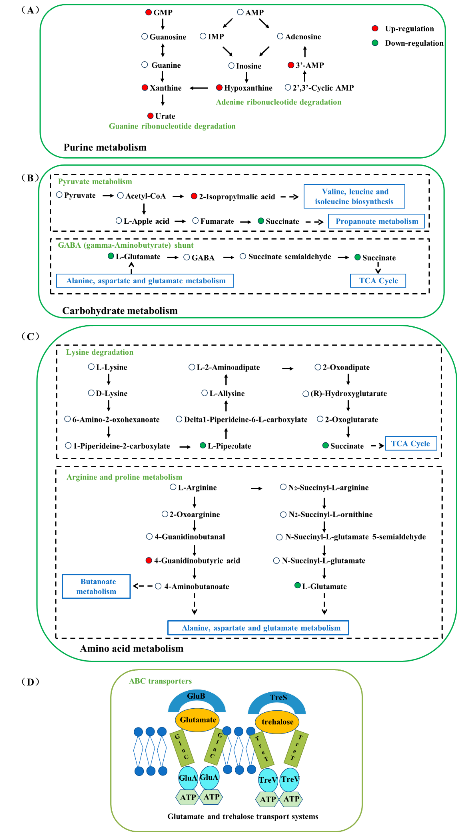 圖 4(A)嘌呤代謝相關途徑、(B)碳水化合物代謝相關途徑和(C)氨基酸代謝相關途徑;(D)膜轉運