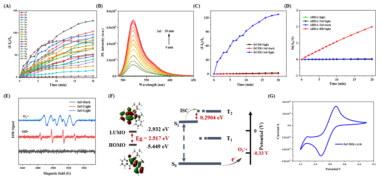 隨后,作者對化合物的光物理性質進行了研究,優異的光物理性質使其具有成為PS的可能,通過對其中20種化合物的總活性氧檢測,作者挑選了效果最好的3af化合物進行后續研究,實驗數據及理論計算等證明3af化合物是一種基于稠環醌結構的純I型PS。(圖4)