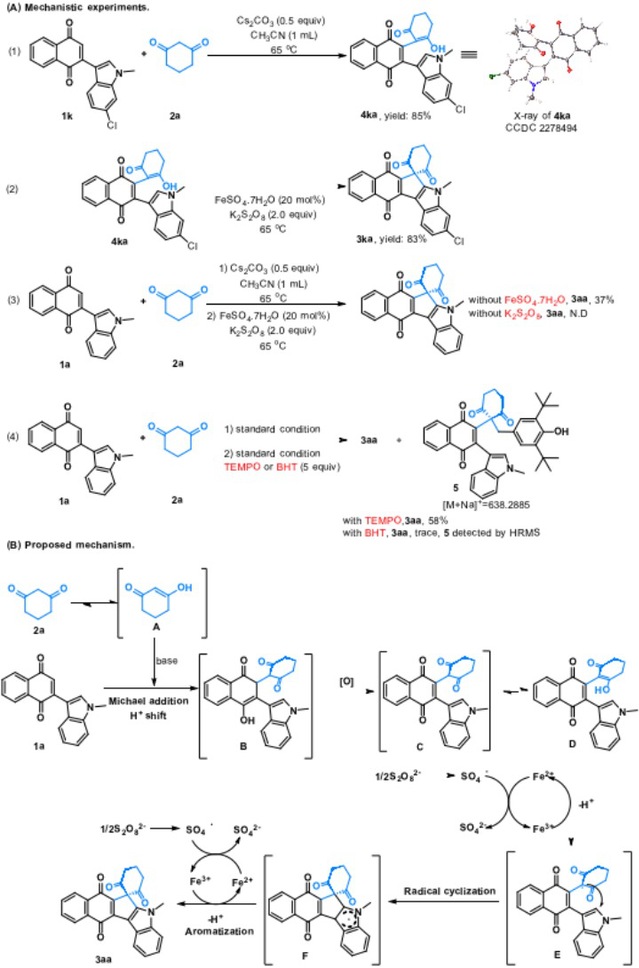 為了探究其反應機理,作者進行了多組對照實驗,結果表明該反應經歷吲哚萘醌和1,3-二羰基化合物的Michael加成/鐵(II)催化的自由基環化/芳構化過程。(圖3)