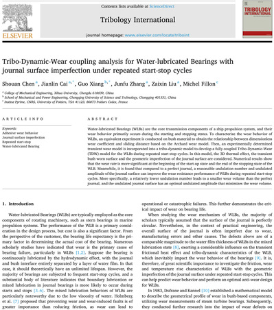 近日,機械工程學院張均富教授研究團隊在SCI期刊《Tribology International》(JCR一區,ISSN:0301-679X,近三年影響因子為6.1)發表題為Tribo-Dynamic-Wear coupling analysis for Water-lubricated Bearings with journal surface imperfection under repeated start-stop cycles的研究論文。團隊陳守安博士為論文的第一作者,法國普瓦捷大學Michel Fillon教授為共同作者,西華大學為論文的第一完成單位。