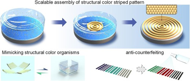 針對(duì)以上問題,該團(tuán)隊(duì)基于前期研究基礎(chǔ)設(shè)計(jì)了一種通過調(diào)控固液氣三相接觸線的快速移動(dòng)在二維或復(fù)雜三維表面組裝納米顆粒的方法,實(shí)現(xiàn)了規(guī)整、可擴(kuò)展和可調(diào)的結(jié)構(gòu)色條紋制備。據(jù)了解,這是首次通過加速揮發(fā)自組裝在大面積基底上實(shí)現(xiàn)了結(jié)構(gòu)色條紋的規(guī)整和可擴(kuò)展生長。并且,通過在組裝表面整合高分子材料,得到了形貌、顏色、表面化學(xué)和環(huán)境刺激響應(yīng)性能可調(diào)的反蛋白石結(jié)構(gòu)色條紋。該研究將獲得的結(jié)構(gòu)色條紋應(yīng)用于防偽識(shí)別、軟體機(jī)器和干細(xì)胞操縱等領(lǐng)域,證明了該自組裝方法和相應(yīng)的結(jié)構(gòu)色條紋在相關(guān)領(lǐng)域的前景和應(yīng)用價(jià)值。