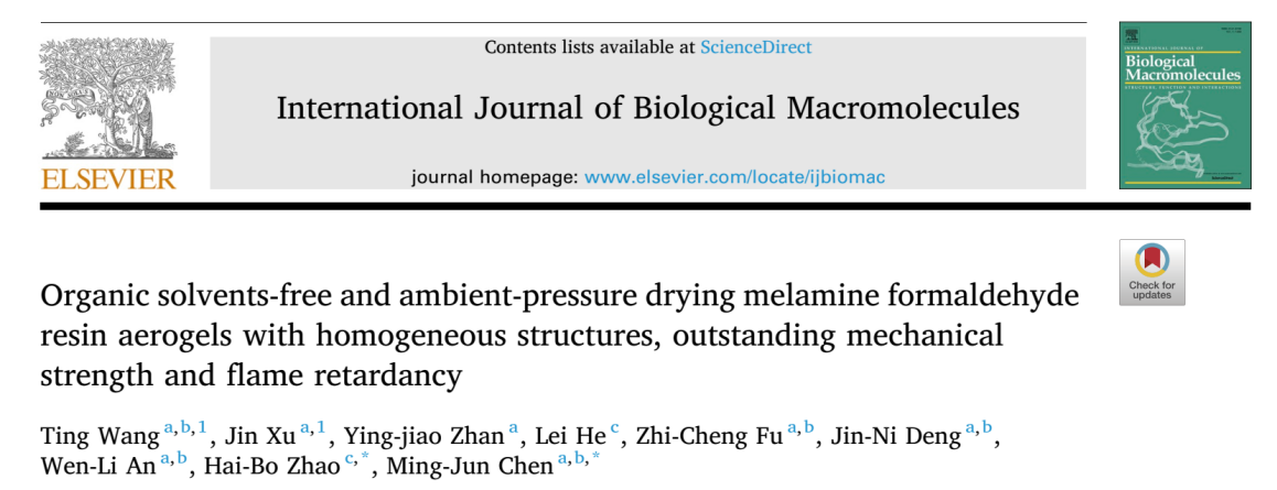此外,創新地利用聚合物原位聚合三聚氰胺甲醛樹脂的方法,成功實現兼具強度和韌性的三聚氰胺甲醛樹脂的合成,實現無溶劑置換的常壓干燥法制備高強度本征阻燃的三聚氰胺甲醛樹脂氣凝膠材料。其成果發表在材料科學領域主流刊物International Journal of Biological Macromolecules (中科院1區TOP,IF: 7.7),第一作者為理學院汪婷副教授和理學院2024屆化學與生物醫藥碩士徐津,通訊作者為四川大學趙海波教授和陳明軍教授,西華大學為第一單位 。