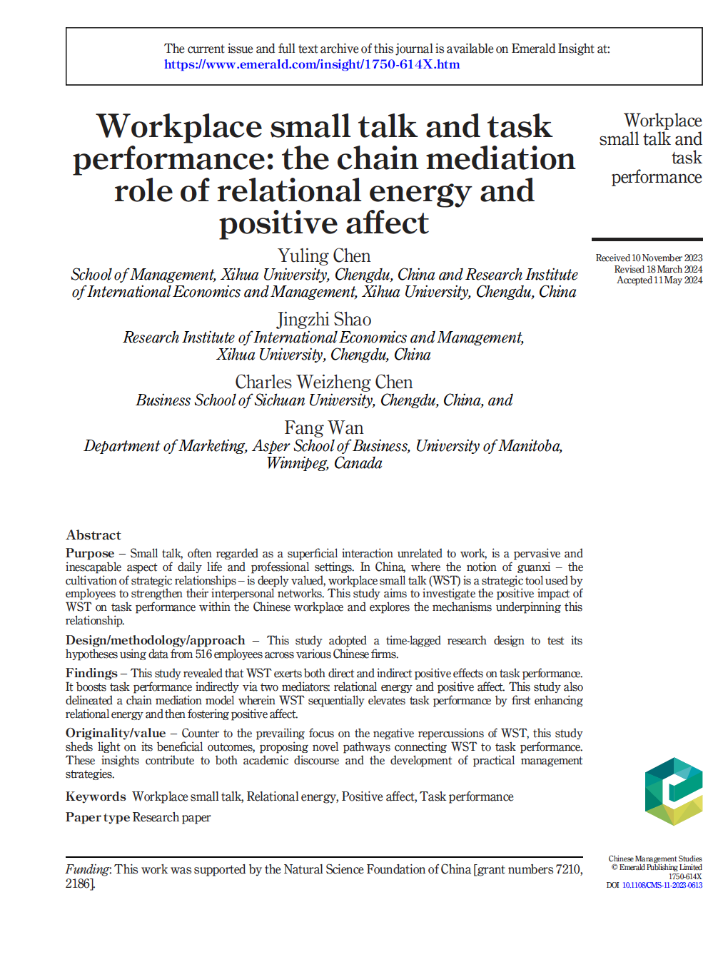 國際經濟與管理研究院2022級工商管理專業碩士研究生邵婧芝主筆的文章在國際期刊《Chinese Management Studies》(SSCI)發表,題為“Workplace small talk and task performance: the chain mediation role of relational energy and positive affect”。陳玉玲副教授為論文的第一作者,碩士研究生邵婧芝為第二作者兼通訊作者,西華大學為論文的第一完成單位。該研究工作為國家自然科學基金青年基金項目(72102186)的階段性成果之一。