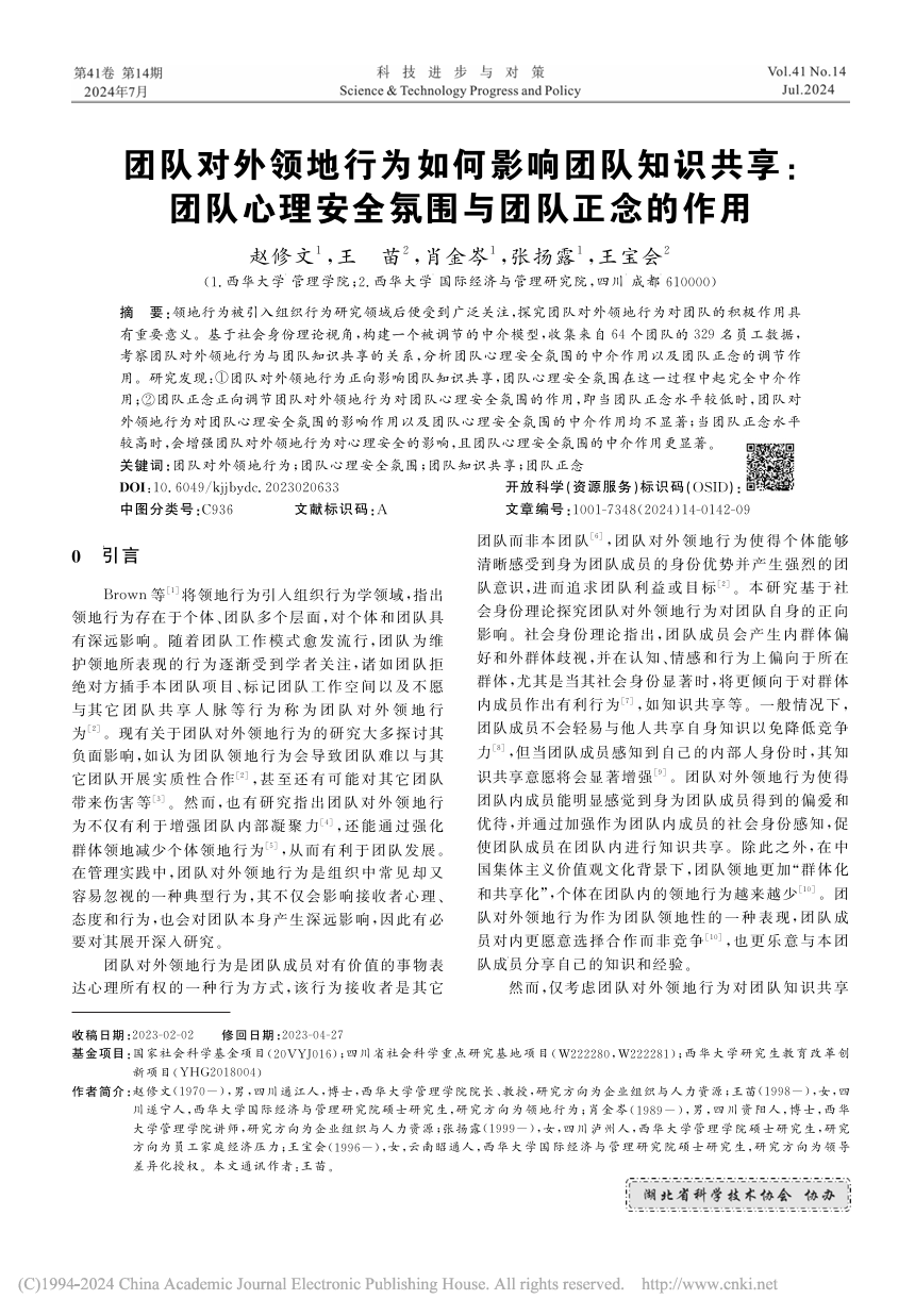 國際經濟與管理研究院2021級工商管理專業碩士研究生王苗主筆的文章在CSSCI收錄期刊《科技進步與對策》發表,題為“團隊對外領地行為如何影響團隊知識共享:團隊心理安全氛圍與團隊正念的作用”。趙修文教授為論文的第一作者,碩士研究生王苗為論文的第二作者兼通訊作者,西華大學為論文的第一完成單位。該研究工作為四川省社會科學重點研究基地項目(W222280,W222281)的階段性成果之一。
