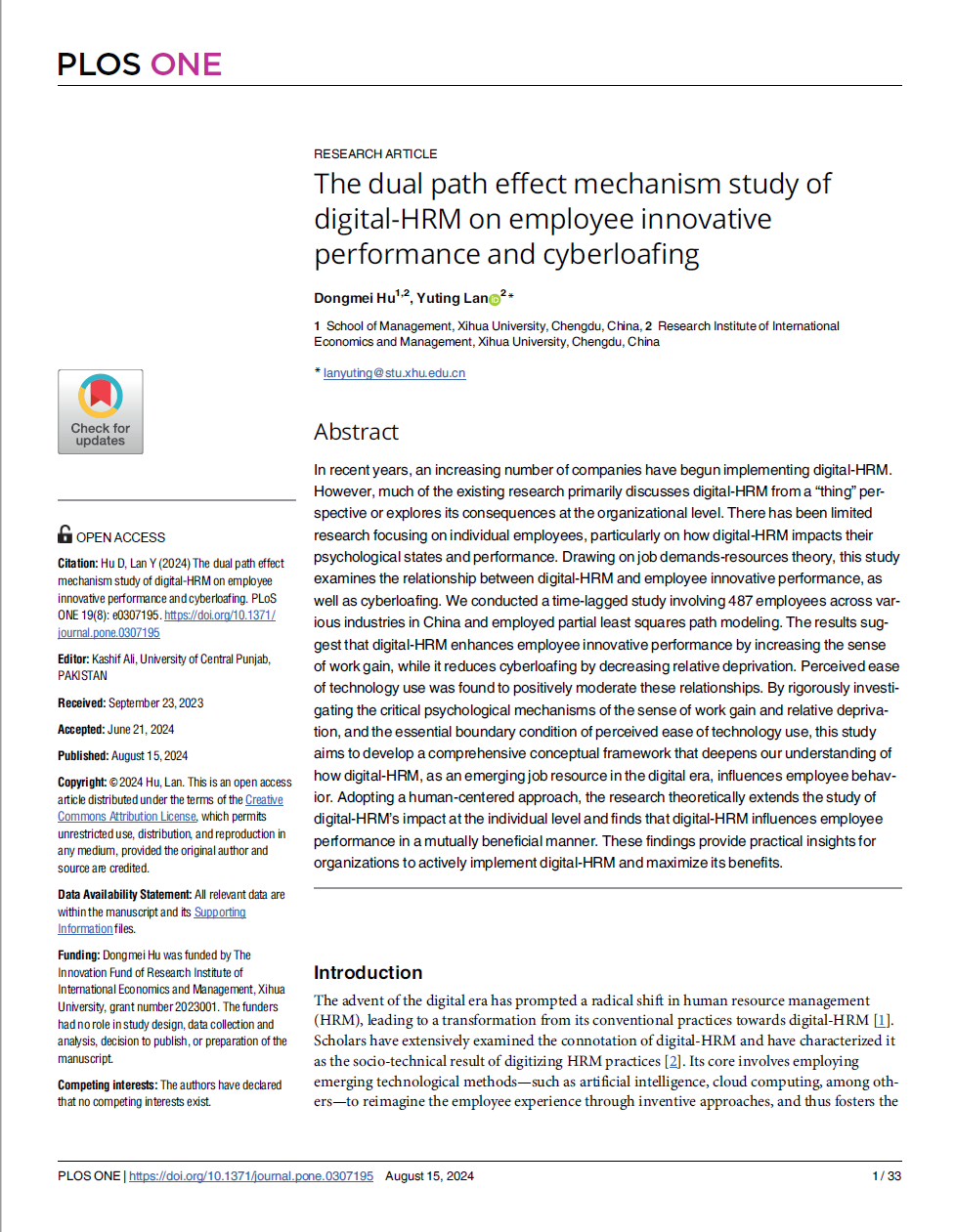 國際經濟與管理研究院2022級工商管理專業碩士研究生藍雨婷主筆的文章在國際期刊《PLOS ONE》(JCR一區)發表,題為“The dual path effect mechanism study of digital-HRM on employee innovative performance and cyberloafing”。胡冬梅教授為論文的第一作者,碩士生藍雨婷為論文的第二作者兼通訊作者,西華大學為論文的第一完成單位。